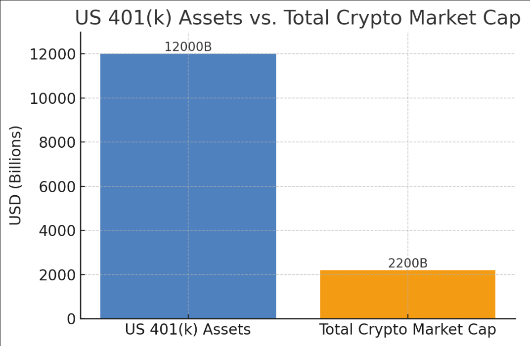 This isn’t just another headline. We’re talking about a structural shift in how retirement savings can be allocated and it’s a massive pool of capital. U.S. defined contribution plans hold around $12 trillion in assets. Even if just 1% flowed into crypto, that’s $120 billion of potential demand, bigger than the market caps of most altcoins combined.