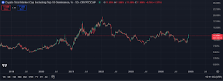 Bitcoin's dominance reflects its market capitalization relative to the total crypto market cap. Historically, a higher dominance indicates a stronger investor preference for Bitcoin over altcoins. The current dominance level suggests that, despite the proliferation of alternative cryptocurrencies, Bitcoin remains the primary store of value and investment choice within the crypto ecosystem.