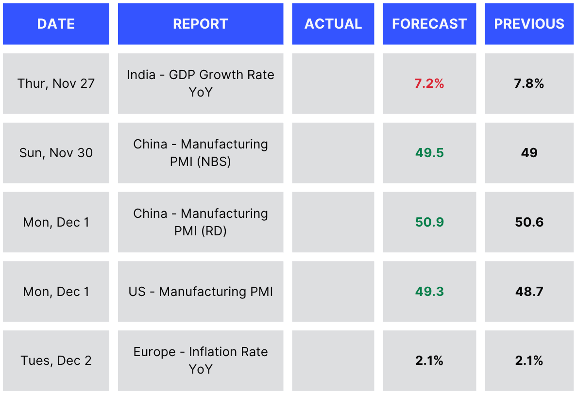 FOMC minutes showed a divergence among participants regarding another rate cut at the December meeting in two weeks. Data-wise, we got mixed labour signals from the US with non-farm payrolls beating expectations (119k vs. 50k) while unemployment ticked up by 0.1% to 4.4%. The bond market has moved to pricing a rate cut with more than 65% likelihood, up from less than 50% last week, as Powell’s latest statement on considering a pause hasn’t been unanimous, with the NY Fed leaning towards a rate cut.