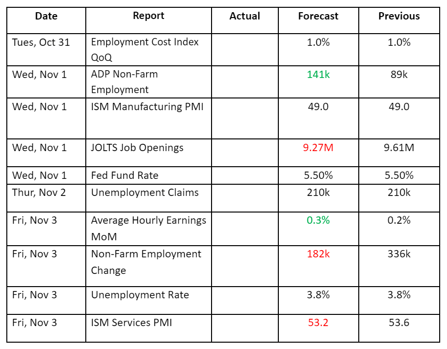 We have the FED rate decision today. We have called for a hold on rates this week with no hikes. US Labor has held up quite well. There are signs of slowing down, but the economy is still strong. The FOMC meeting will play a significant role in shaping market sentiment this week. The CME Group’s FedWatch Tool predicts a 97% likelihood that interest rates will remain unchanged at this meeting, decreasing to a 68% probability for the December meeting. Market participants also await the US Treasury's refunding announcement on Wednesday, detailing its plans to sell tenures to offset Washington’s budget deficit.