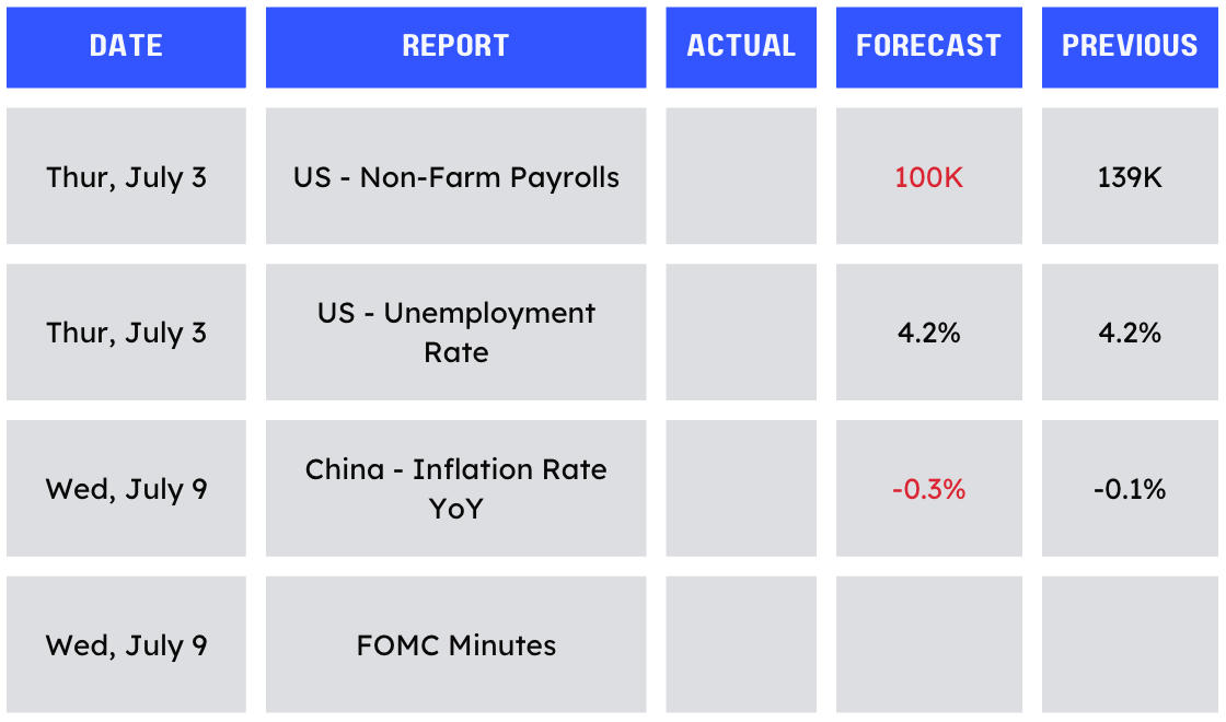 US data, such as GDP growth and personal spending, came out slightly worse than expected, and Trump continues to apply pressure to the Fed to cut rates. Data-wise, it's a very quiet week ahead of the US 4th of July holiday. We have Non-Farm Payrolls (expected to be softer than last month) and US unemployment data tomorrow, as well as FOMC minutes next Wednesday.