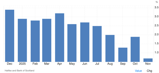 The housing market remains stable; however, growth appears to be stalling, according to the Halifax House Price Index. Prices rose 0.7% year-on-year in November 2025, down from 1.9% in October and marking the slowest growth since March 2024; however, prices still reached new all-time highs. The Index was flat compared with a month earlier, indicating that the decline in growth primarily reflects stronger price growth a year earlier relative to weaker price growth now.