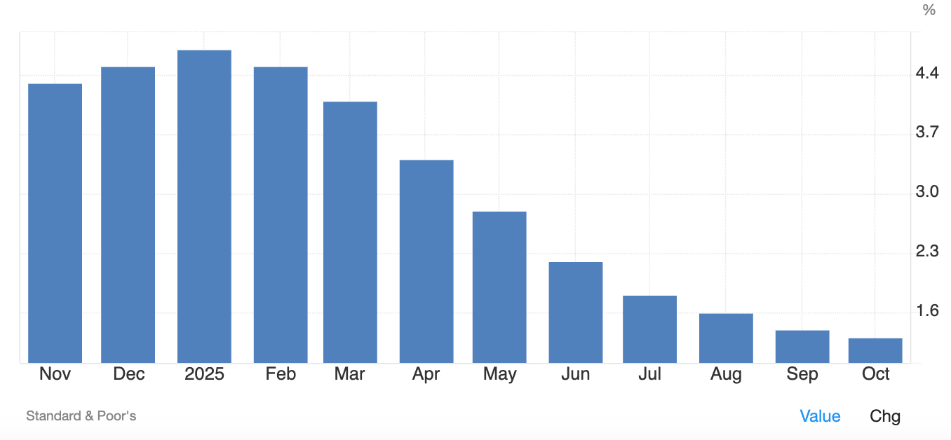 The Case-Shiller 20-City Home Price Index rose by 1.3% year-on-year for October, marking the smallest increase since the summer of 2023. The index eased from a 1.4% hike in September; however, it was slightly above the 1.1% forecast. Geographically, the largest gains were in Chicago (5.8% annually), followed by New York (5%).