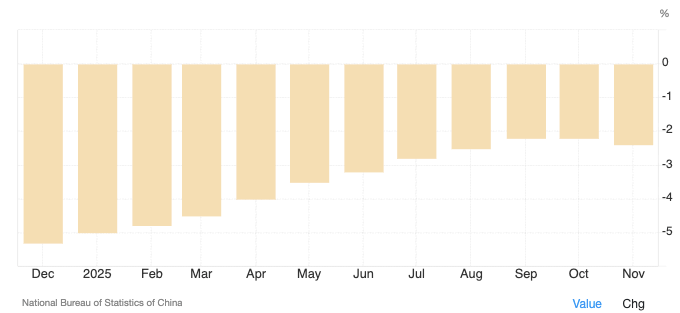 On the negative side, China’s retail sales and industrial production continue to grow year-on-year; however, they are easing significantly from their latest prints and showing their weakest growth in over 18 months and 3 years, respectively. Retail sales rose 1.3% year-on-year, easing more than half the growth recorded last month, 2.9% and missing expectations for 3.3%. Industrial production grew 4.8% year-on-year in November 2025, slowing from a 4.9% increase in the previous month and missing market expectations of 5.4%.