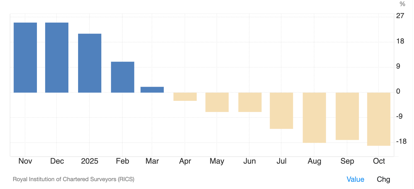 The RICS Residential Market Survey slipped once again to -19% for October from -17% in September, missing expectations for an improvement to -14%. This reading has dropped six times in the last seven prints, suggesting an overall bearish outlook for the property market, at least sentiment-wise. The weakest links across the UK are in London, the South East, and East Anglia. The survey suggests prices will decline over the next three months, even though this has improved from previous months. In the long-term outlook (12+ months), respondents are generally leaning more bullish.