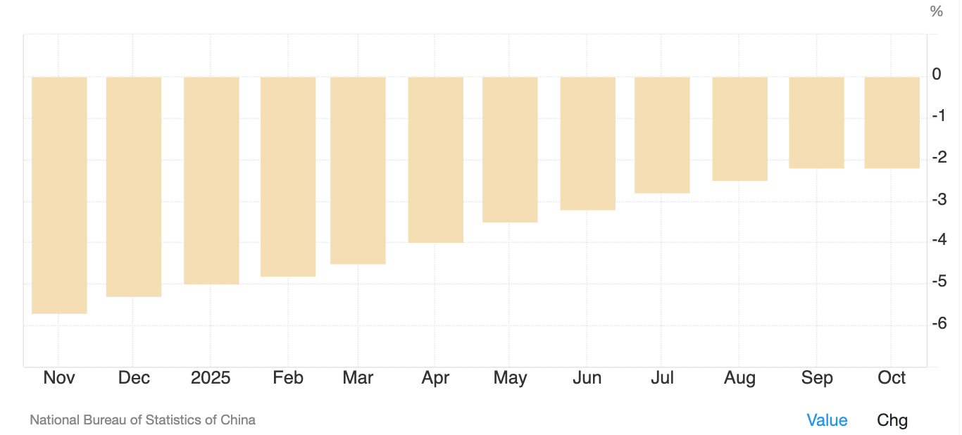 China’s nationwide new home prices dropped 2.2% year-on-year in October, matching the pace of decline in the previous month but remaining the slowest since March 2024. This is the 28th straight month of price declines. The main city outlier is Shanghai, where prices rose by 5.7% year-on-year. Monthly, nationwide prices were 0.5% lower, the steepest decrease in a year, after a 0.4% fall in September.