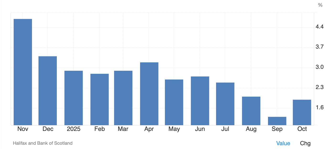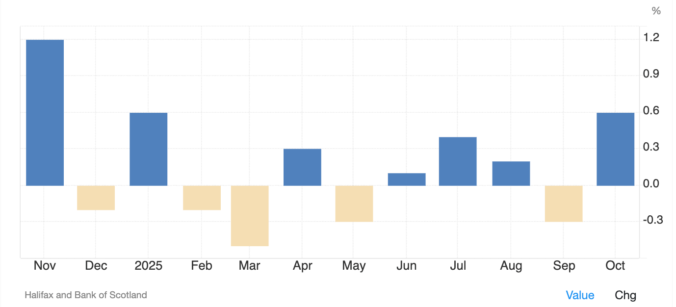 The housing market remains resilient, according to the Halifax House Price Index, which increased 1.9% year-on-year in October, following a 1.3% rise in September and beating expectations of +1.45%. This takes the average property value to new record highs, just shy of £300,000. Prices were up by 0.6% on a month-on-month basis, more than reversing the -0.3% drop last month.