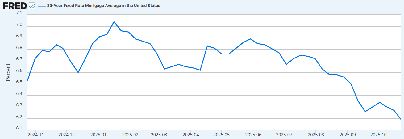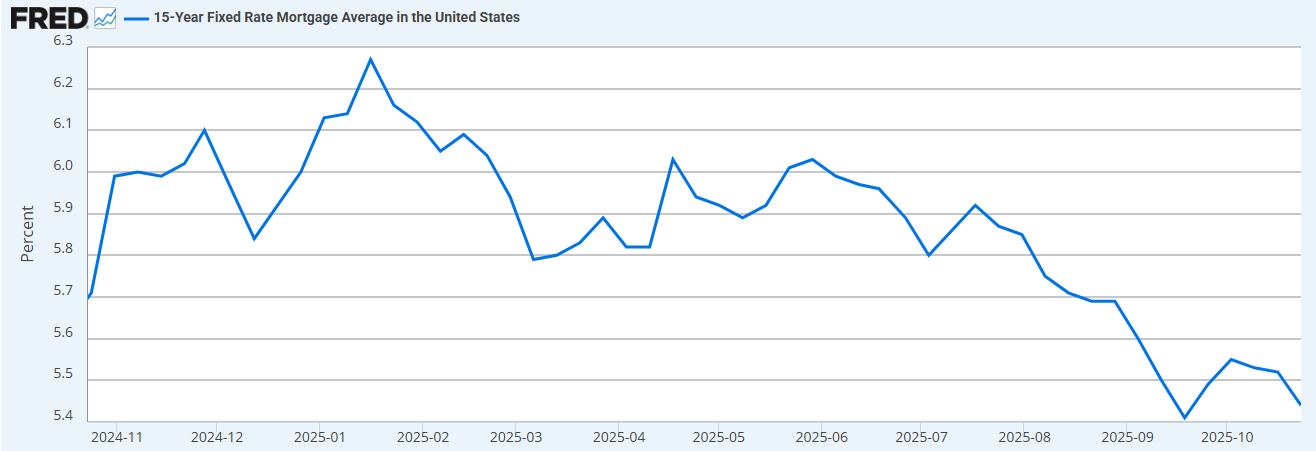 Mortgage rates continue their downward trend, reflecting the Fed's resumption of rate cuts. This marked the 4th consecutive month of declining rates. 30-year and 15-year rates collapsed by more than 15 bps and 10 bps, respectively, in October.