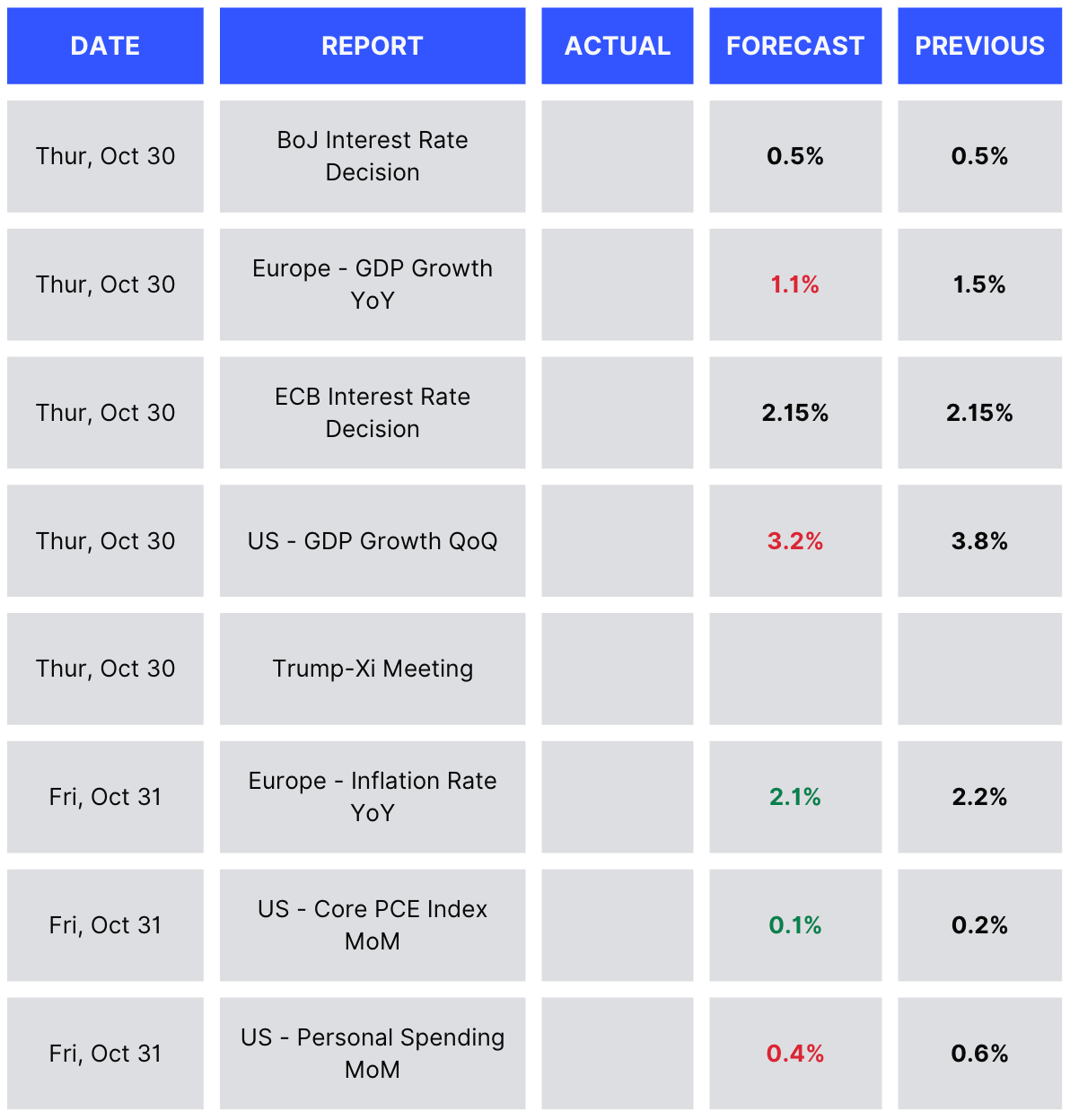 Looking ahead, the market focus shifts to tomorrow’s meeting between Trump and Xi, which will be pivotal for trade relations between the US and China. The BoJ and the ECB are both expected to keep rates unchanged tomorrow at 0.5% and 2.15% respectively. GDP growth for both Europe and the US is expected to be lower than their previous prints, while Europe’s inflation figure and the US’s PCE Index are both expected to tick lower from their previous print.