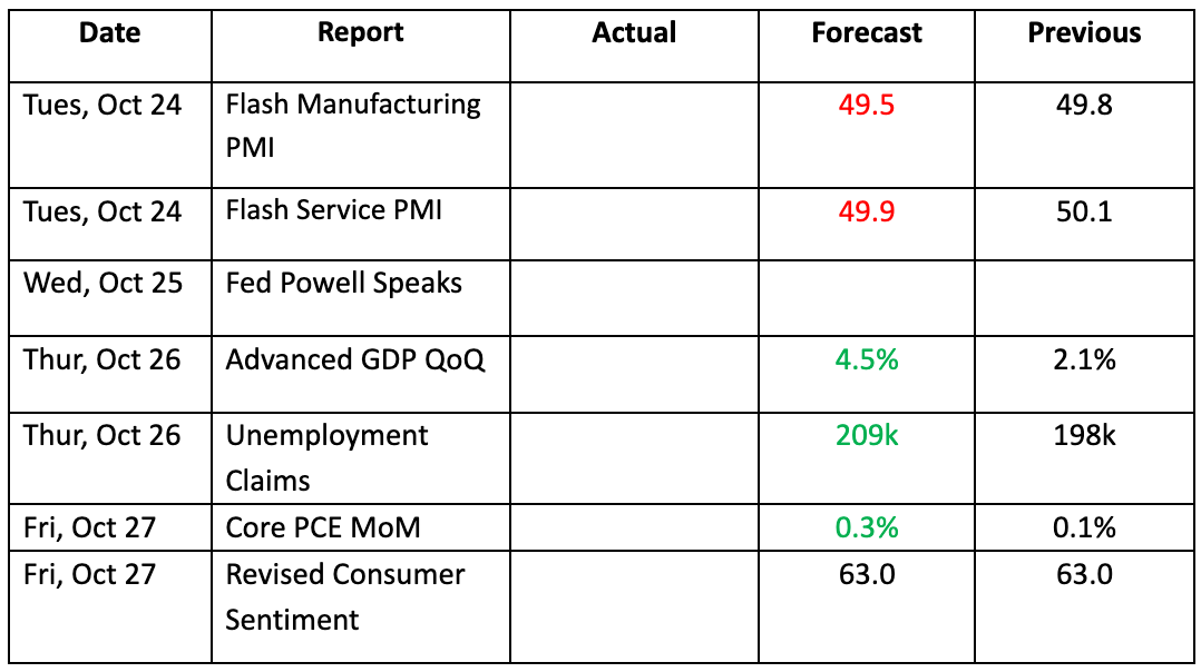 GDP will be announced at 8.30 a.m. E.T. on October 26. Nowcasts suggest that annualized real GDP growth could come in at over 5%, and professional economists see growth topping 3% after a trend of upward revisions in recent weeks. Even if the 3% forecasts hold, that would still be an impressive growth rate. The October 26 GDP number will be the first of three progressively more accurate estimates for Q3 GDP Growth from the Bureau of Economic Analysis, with revised estimates coming on November 29 and December 21. Subsequent revisions can adjust the advanced estimate of GDP growth by half a percent up or down, on average.